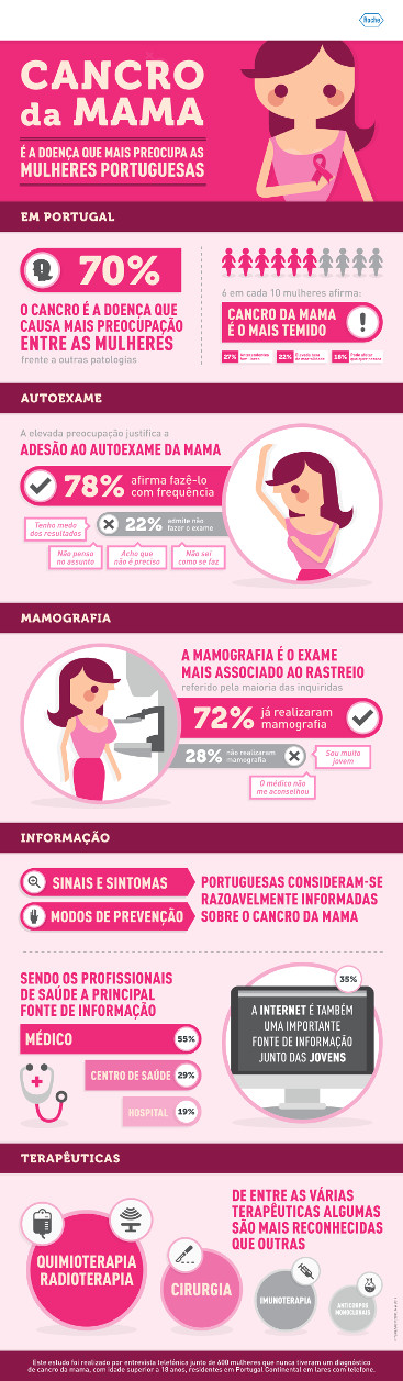 O cancro é a doença que mais preocupa as mulheres portuguesas, com 70% a apontarem-na espontaneamente à frente de qualquer outra patologia, revela um estudo realizado em fevereiro deste ano pela GFK para a Roche Farmacêutica. Seis em cada 10 mulheres inquiridas referem também espontaneamente o cancro da mama como aquele que mais temem.