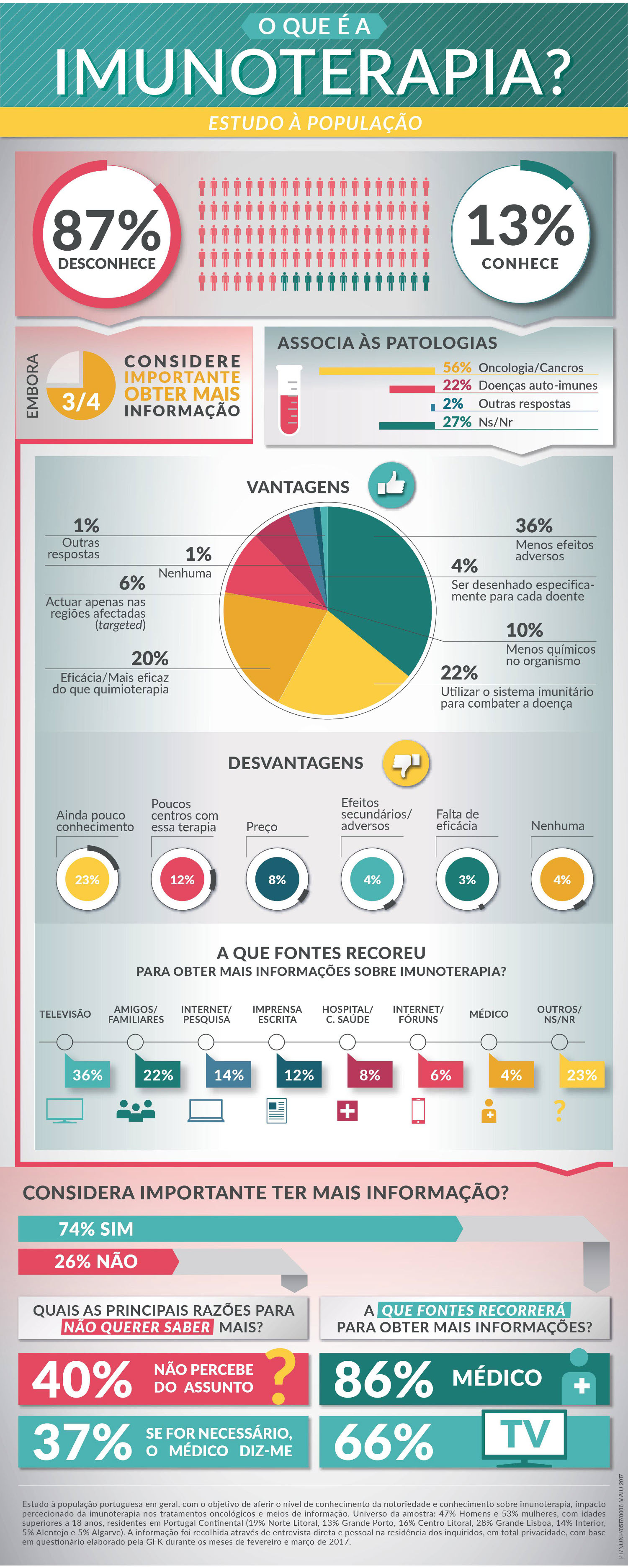 Estudo à população portuguesa em geral, com o objetivo de aferir o nível de conhecimento da notoriedade e conhecimento sobre imunoterapia, impacto percecionado da imunoterapia nos tratamentos oncológicos e meios de informação. Universo da amostra: 47% Homens e 53% mulheres, com idades superiores a 18 anos, residentes em Portugal Continental (19% Norte Litoral, 13% Grande Porto, 16% Centro Litoral, 28% Grande Lisboa, 14% Interior, 5% Alentejo e 5% Algarve). A informação foi recolhida através de entrevista direta e pessoal na residência dos inquiridos, em total privacidade, com base em questionário elaborado pela GFK durante os meses de fevereiro e março de 2017.